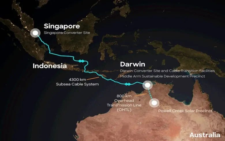 This project reminded me of the Australia-Asia Power Link (AAPowerLink), a transmission line of around 5,000 kilometers (around 4,300 kilometers submarine and 800 kilometers of overhead line) that aims to transport electricity from northern Australia to Singapore and has recently reached an important environmental milestone.