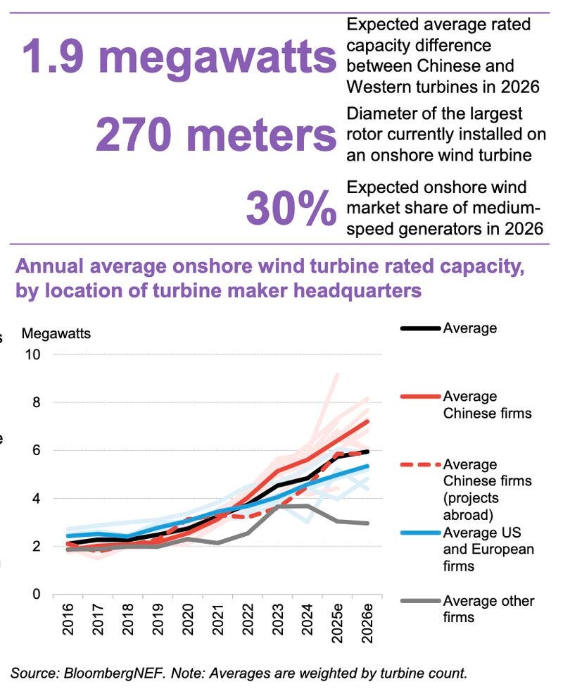 The average rated power of Chinese turbines reached 5.6 MW in 2024, compared to 4.6 MW in Western markets.